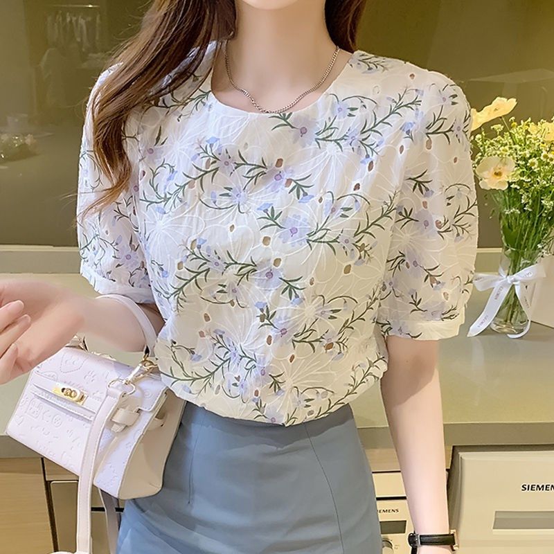 女装2021新款潮短袖碎花雪纺衫女设计感小众洋气衬衫蕾丝上衣热门设计联盟服务商
